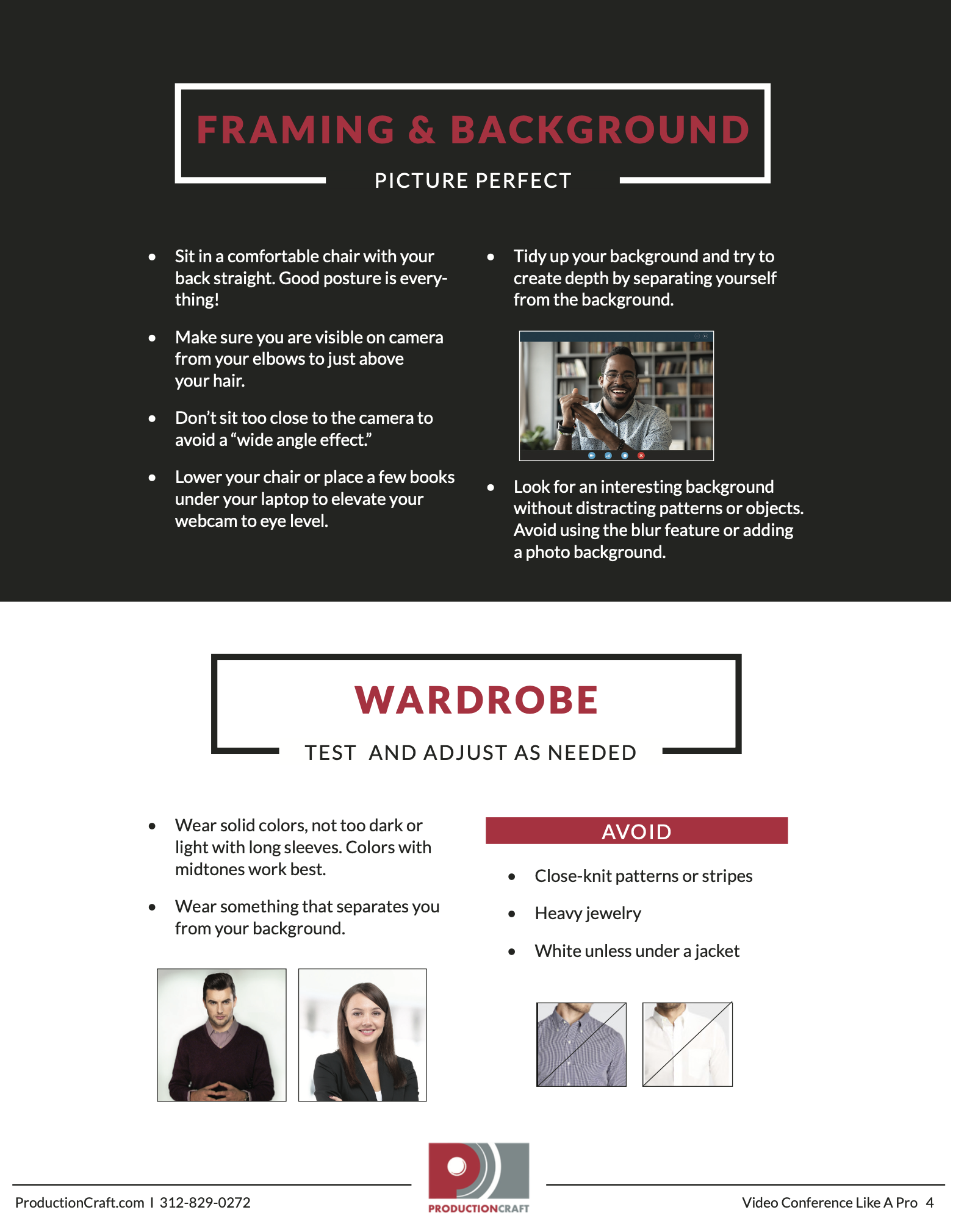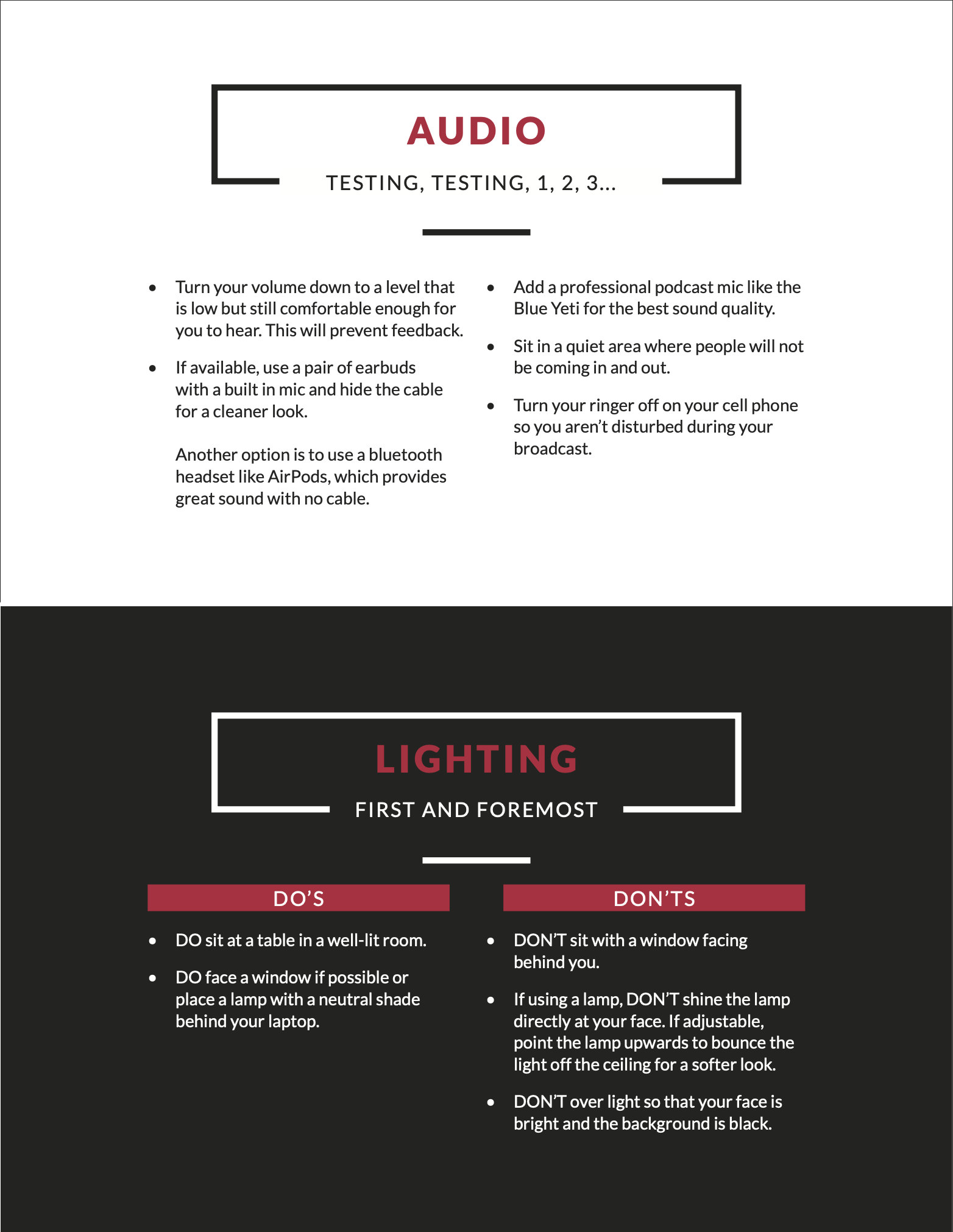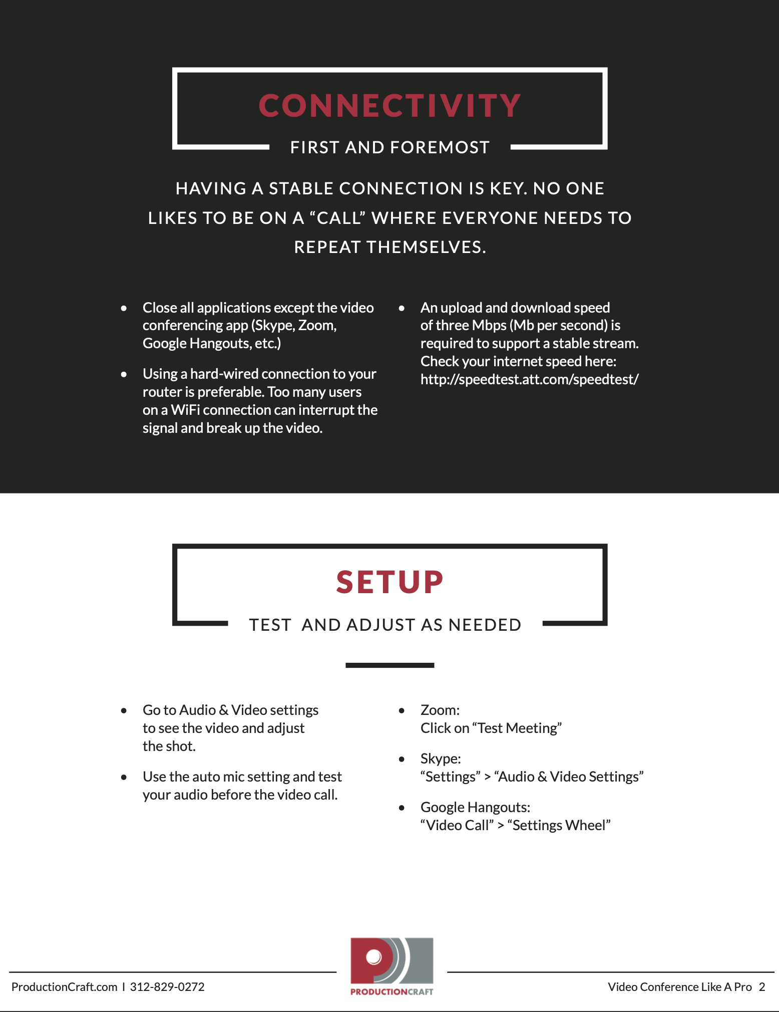 In our post-covid world video calls are more prevalent than ever. As video production experts, we prefer to shoot interviews and meetings in person to achieve the best quality, but sometimes the subject doesn’t have the time, can’t travel, or it’s just not in the budget. For cases like these, we created this packet of tips and tricks for our clients. Quality is key when it comes to video for any purpose, and this packet is concise and easy to follow. Feel free to download and use on your next project!